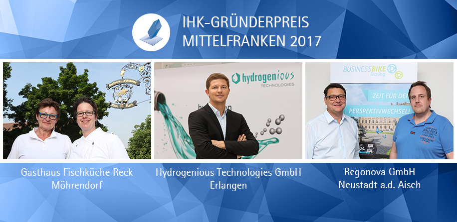 Ein modernes Konzept für ein traditionsreiches Gasthaus, eine wissenschaftliche Innovation in der Wasserstofftechnologie und ein Leasing-Modell für Dienstfahrräder: Für diese Geschäftsideen sind Doris Reck-Hartmann (Inhaberin des Gasthauses Fischküche Reck, Möhrendorf), Dr. Daniel Teichmann (Geschäftsführer der Hydrogenious Technologies GmbH, Erlangen) sowie Werner Weinmann und Andreas Gundermann (Geschäftsführende Gesellschafter der Regonova GmbH, Neustadt a.d. Aisch) mit dem IHK-Gründerpreis 2017 ausgezeichnet worden. Die drei Preisträger erhalten ein Preisgeld von jeweils 10.000 Euro, das von der IHK bereit gestellt wird.